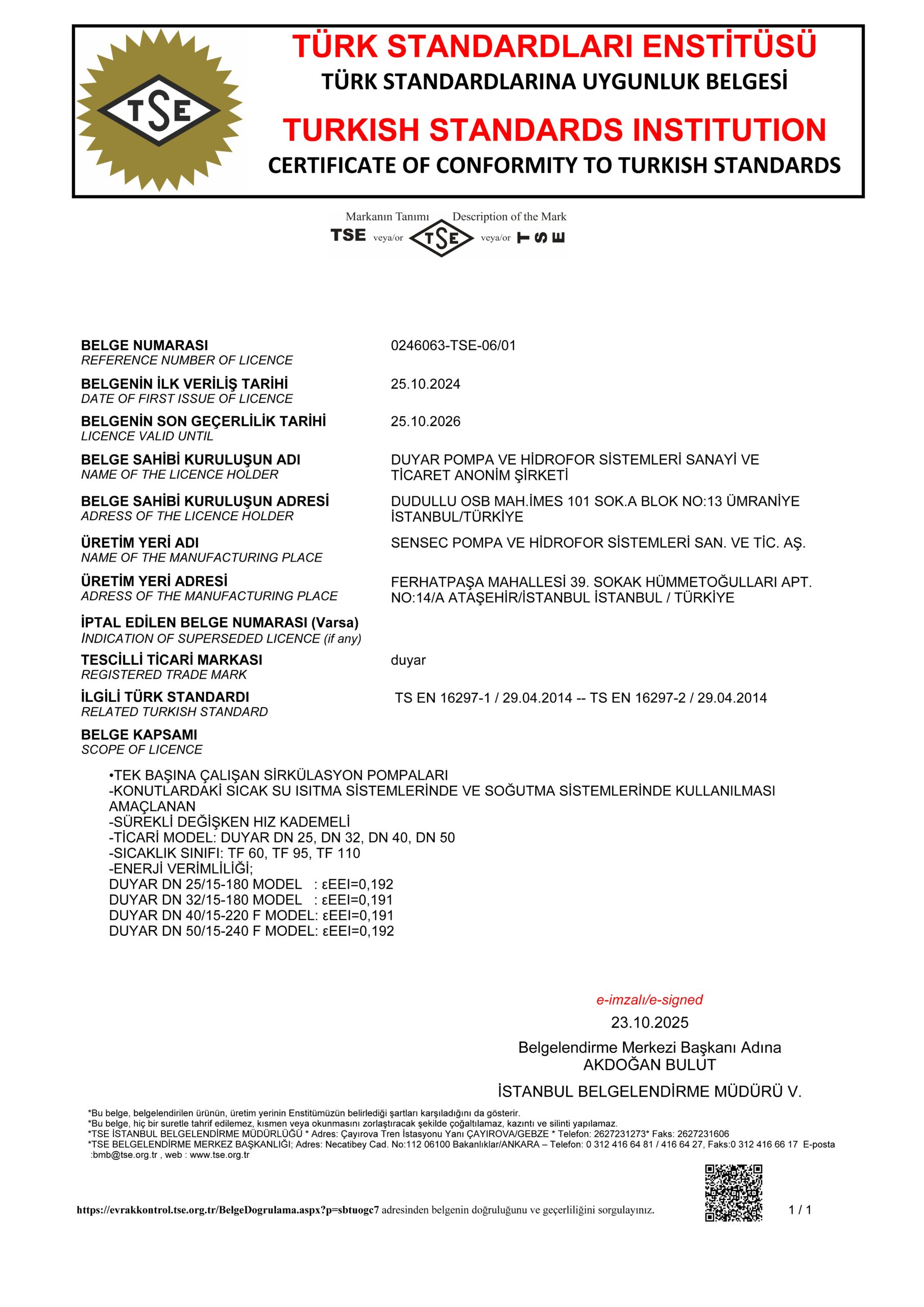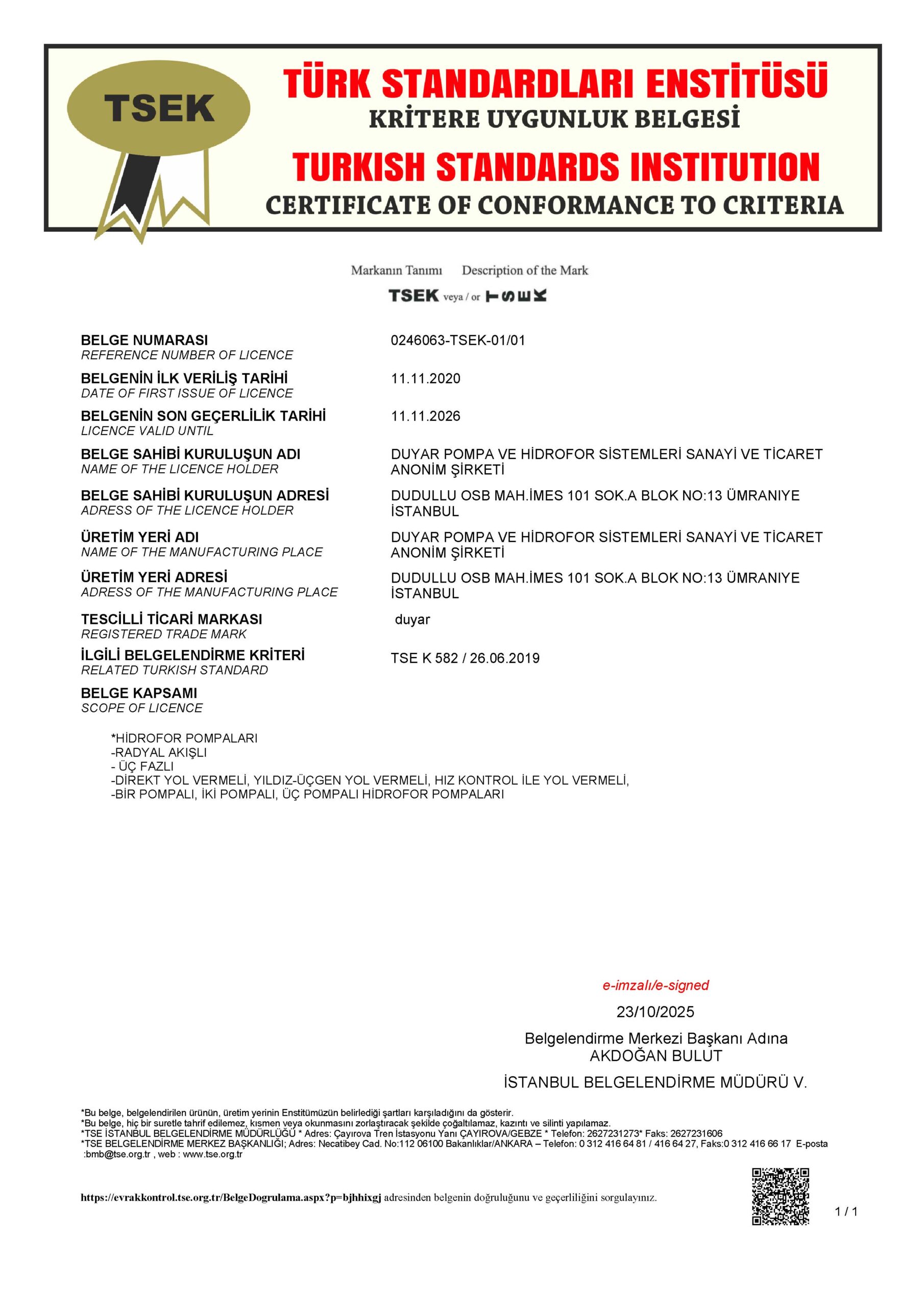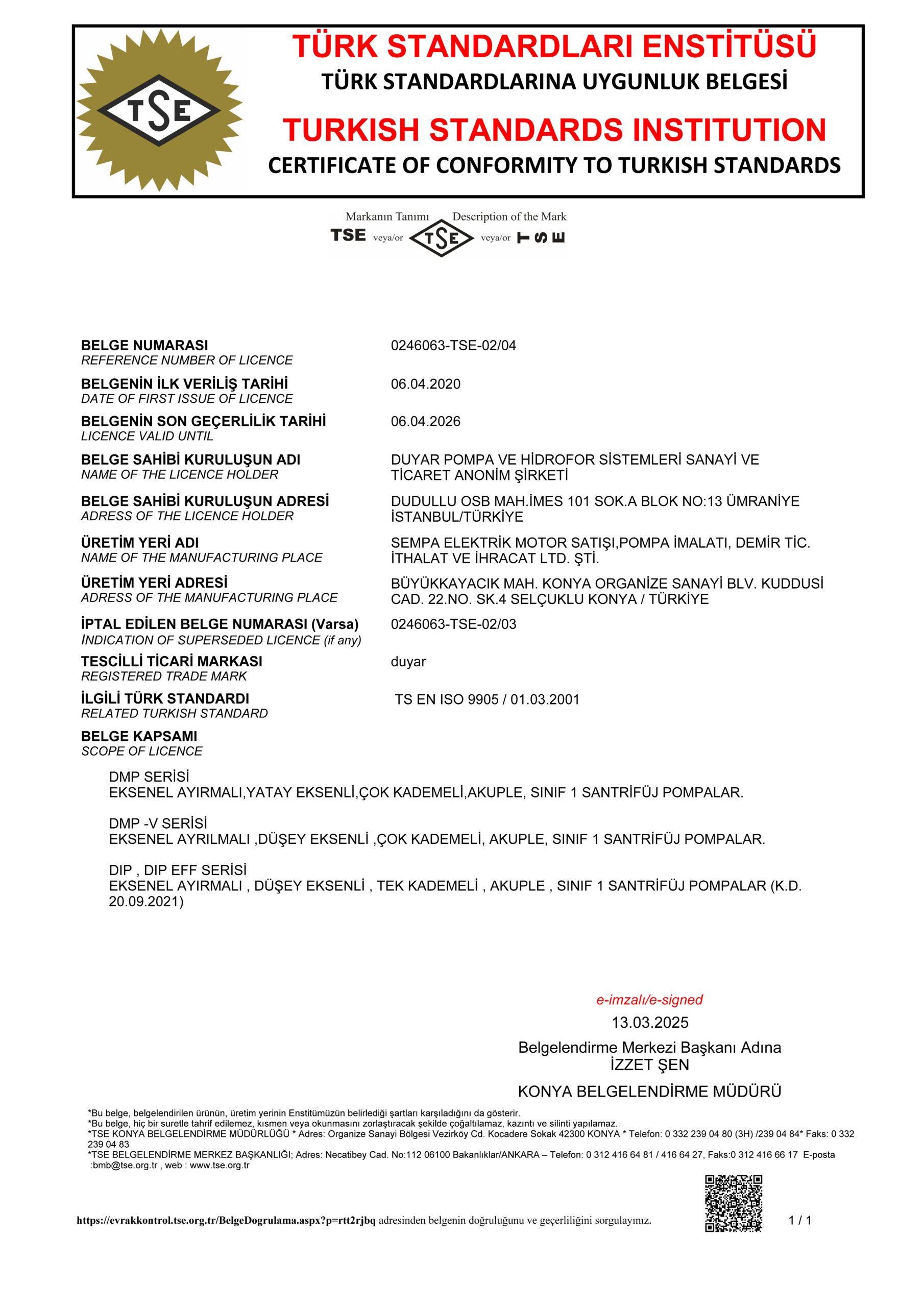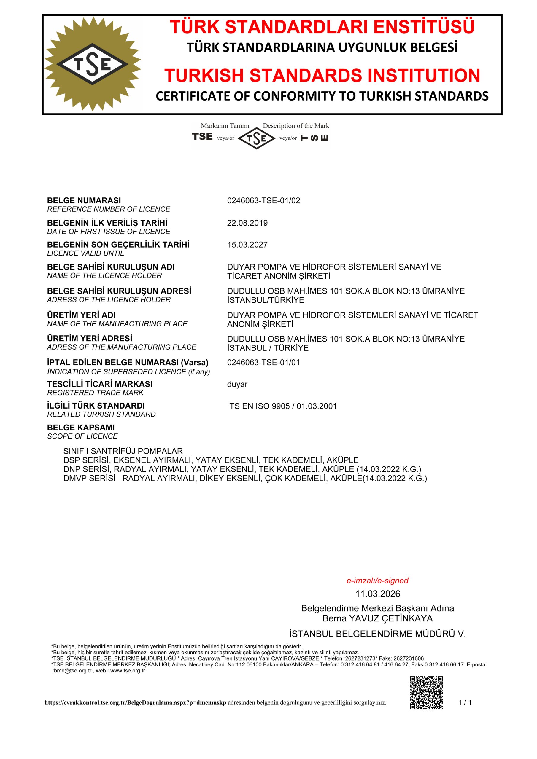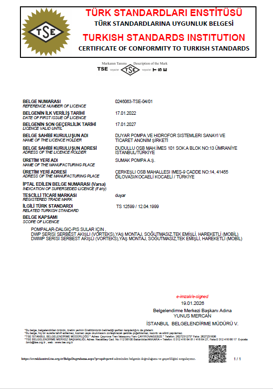DSP, DNP, DMVP POMPALARI TSE SERTİFİKASI DMVP HİDROFORLAR TSE SERTİFİKASI GENLEŞME TANKLARI TSE SERTİFİKASI DMP, DMP-V, DIP TSE SERTİFİKASI OPUS SİRKÜLASYON POMPALARI TSE SERTİFİKASI DWWP ATIK SU POMPALARI TSE SERTİFİKASI CE DECLERATION OF CONFORMITY DIP - OPUS CE DECLERATION OF CONFORMITY DMVP HİDROFORLAR CE DECLERATION OF CONFORMITY DSP, DNP, DMVP POMPALARI CE DECLERATION OF CONFORMITY DWWP ATIK SU POMPALARI ISO 9001: 2015 ISO 14001: 2015 NFPA 20